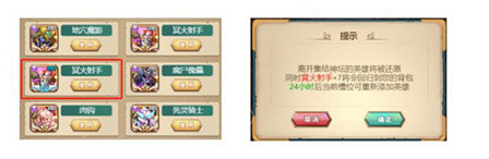 英雄提升后将留在神坛中,若要取出英雄,将退回所有使用的资源,并产生24小时的冷却时间,冷却期间,不可放入其他英雄。同一行内也不可对相同的英雄进行提升。
