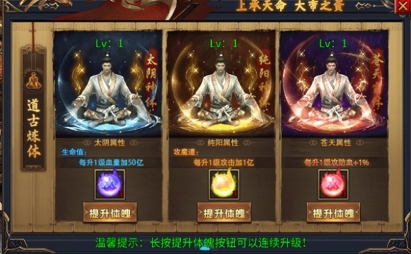 提升太阴、纯阳、苍天等属性体魄,能分别增加生命、攻击、防御等属性。