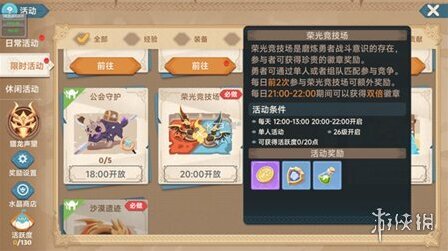8、荣光竞技场:跨服PVP玩法,每天12-13点、20-22点(双倍时间)开启,玩家可获得徽章奖励,每周徽章获取有上限限制,每天前2场战斗有额外奖励,为更快打满徽章,建议玩家每天20-22点参与活动。