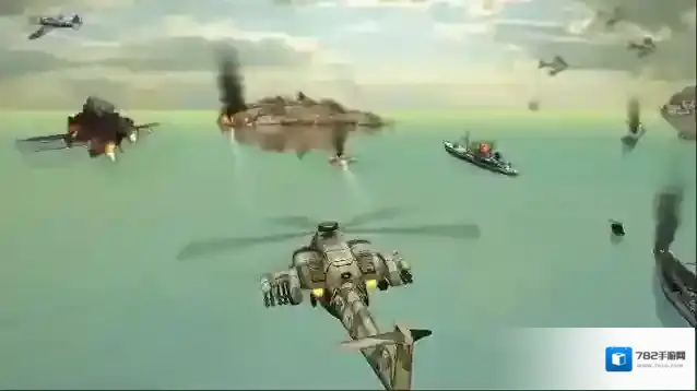 3、战斗场景,操控直升机,在陆海空战场,射击敌方战机、摧毁地面目标,完成消灭敌人任务,展现空战玩法,画面有爆炸、战机缠斗特效。