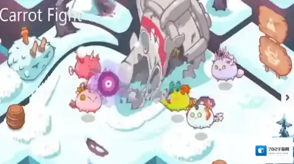1、在Carrot-Fight首场景,点击箭头指向的紫色角色,触发互动(战斗/任务),推进游戏。