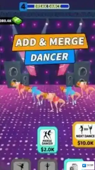 1、有“ADD&MERGEDANCER(添加并合并舞者)”玩法提示,以及“NEWDANCER”“NEXTDANCE”等功能按钮,玩家可通过添加、合并舞者来经营舞蹈团队,开展舞蹈表演。
