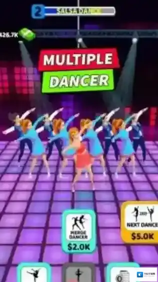 3、“MULTIPLEDANCER”提示,还有“MergeDancer”“NextDance”功能按钮,呈现舞者表演萨尔萨舞的场景,玩家可通过合并舞者、解锁新舞蹈来经营舞蹈团队。