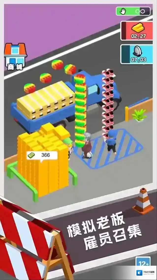 2、进入经营场景,关注卡车旁堆叠的货物,利用倒计时及时处理,点击商城补充资源,维持运营。