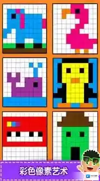 1、在像素填色模式下(如图像中像素画示例),玩家可选择不同的像素图案(如动物图案)。