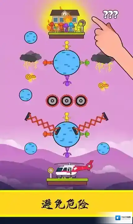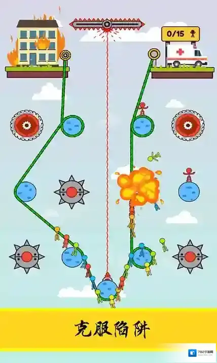 2、在拉绳过程中,玩家需让小人躲避齿轮、火焰、爆炸等危险陷阱,确保小人安全。