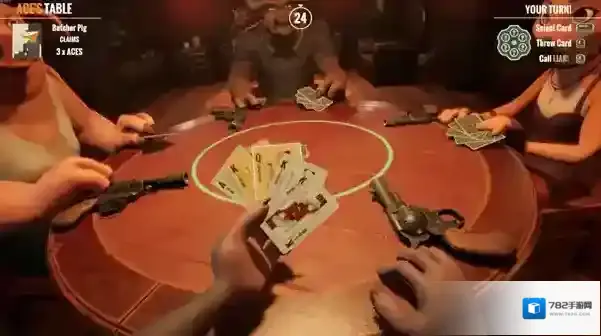1、核心卡牌玩法紧张刺激,4人轮流出牌并宣称点数,其他人可质疑,成功质疑能让对方接受俄罗斯轮盘惩罚。