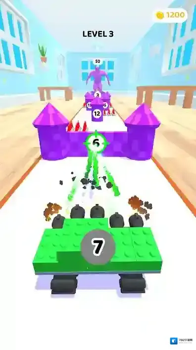 3、玩家驾驶战车发射炮弹,攻击紫色的城堡和机器人等目标,通过精准打击,在规定时间内击破目标,推进游戏进程。
