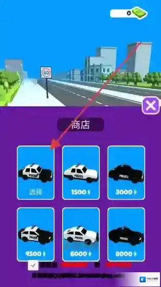 2、进入商店界面,可选择已拥有的警车(如第一个“选择”),或花费金币购买其他警车,驾驶对应警车执行道路任务。