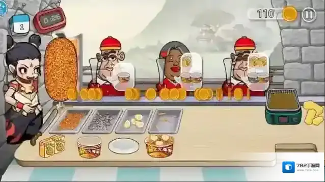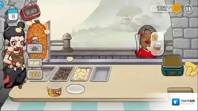2、面对排队顾客,观察其订单要求,从食材区选取对应配料快速完成制作交付。