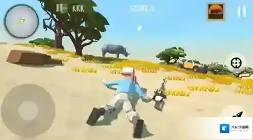 3、躲“犀牛”!被撞倒地,点左侧移动,绕树跑,3秒摆脱,每猎10只,领新枪(狙击+5),分数翻倍。