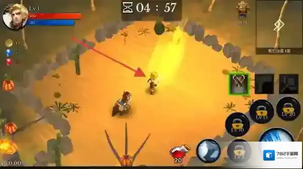 3、利用虚拟按键操控角色移动、攻击,靠近怪物触发战斗,通过技能释放击败敌人,积累经验,推进沙漠冒险。