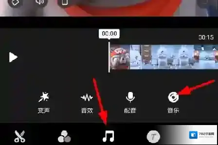 2、接下来我们就可以对添加的视频进行编辑了,通过点击底端的音乐按钮打开音乐便捷功能列表,在列表中我们选择音乐功能即可添加配乐了。