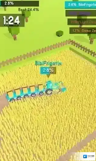 1、在游戏中操控收割机(如紫色收割机),按箭头指示在农田行驶,收割作物,注意屏幕上方进度(如5.2%)和剩余时间(1:15)。