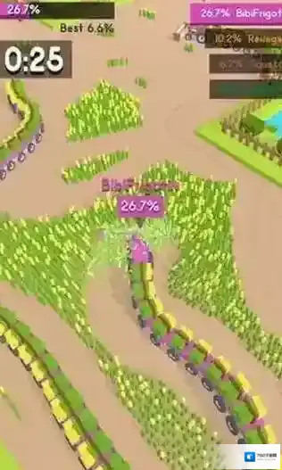 2、继续游戏,按箭头方向操作收割机(如紫色收割机)在不同农田区域作业,提升收割进度(如26.7%),留意剩余时间(0:25)和对手进度。