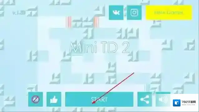 1、进入主界面后点击START按钮,选择像素风格的初始地图与挑战难度,滑动屏幕进入炮塔布置场景。