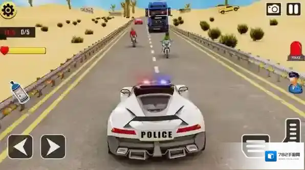 3、在沙漠公路场景,驾驶警用超跑,追击摩托目标,利用虚拟按键控制车辆加速、转向,保持追捕节奏,根据任务提示,成功拦截目标,完成缉凶任务。