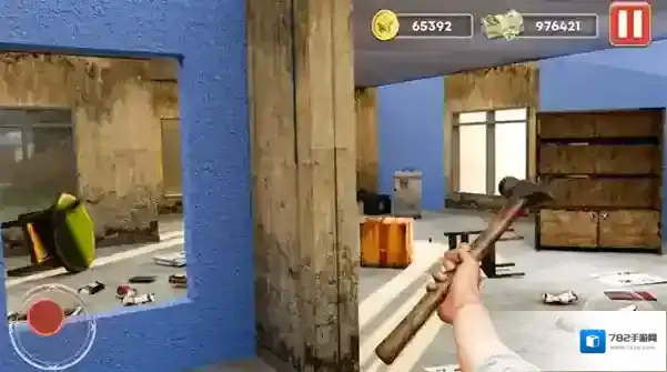 1、在破旧房屋场景,操控手持锤子角色,按箭头指引破坏指定位置(如蓝色墙体),获取改造资源。