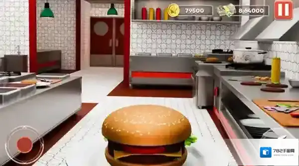 2、进入厨房场景,依据箭头提示,点击桌上汉堡,开启制作或升级流程,积累金币等货币。