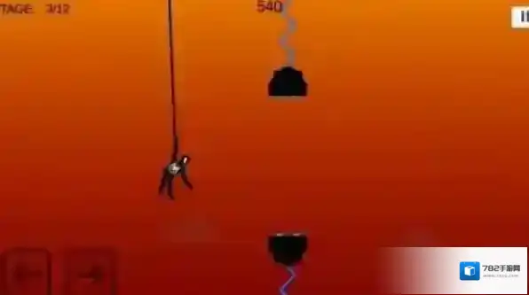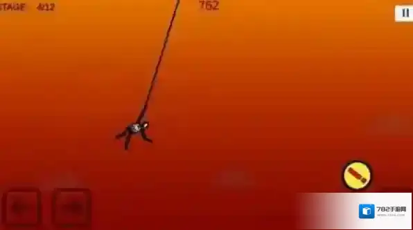 2、操控火柴人,点击右侧方块按钮,释放/收回蜘蛛丝,让角色在场景中摆动,跨越障碍,注意把控点击节奏,保持角色移动轨迹。