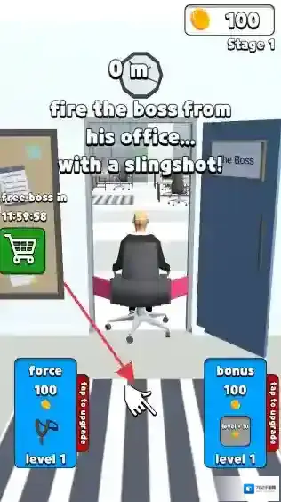 1、依据“fire the boss from his office… with a slingshot!”提示,点击下方弹弓区域,拉动弹弓瞄准办公室内老板,释放将其击飞,开启关卡。