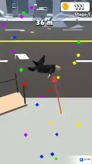 2、老板被弹射至户外后,借助场景彩色碎片,关注飞行距离(36m),利用物理弹射规律,让老板尽可能飞远,积累金币,为后续升级蓄力。