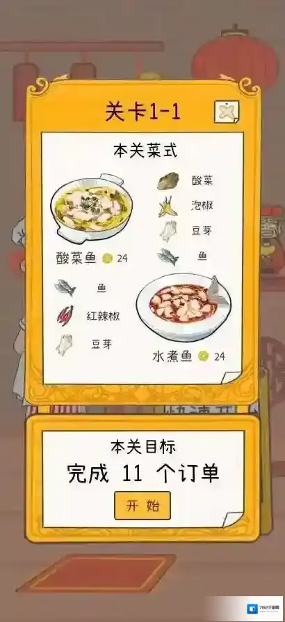 3、备齐酸菜鱼食材,点击开始完成11个订单目标。