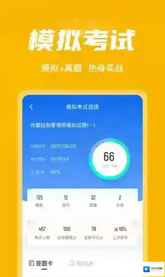 体重控制管理师题库内含考点练习,全国通用卷以及地区卷模拟练习,以及按照固定考试比重的随机式的抽题的真题考场,成绩单实时记录考试数据,一点一滴的反馈考生近期学习状态以及自我正确率的提升,大大的给予考生通过考试的信心。