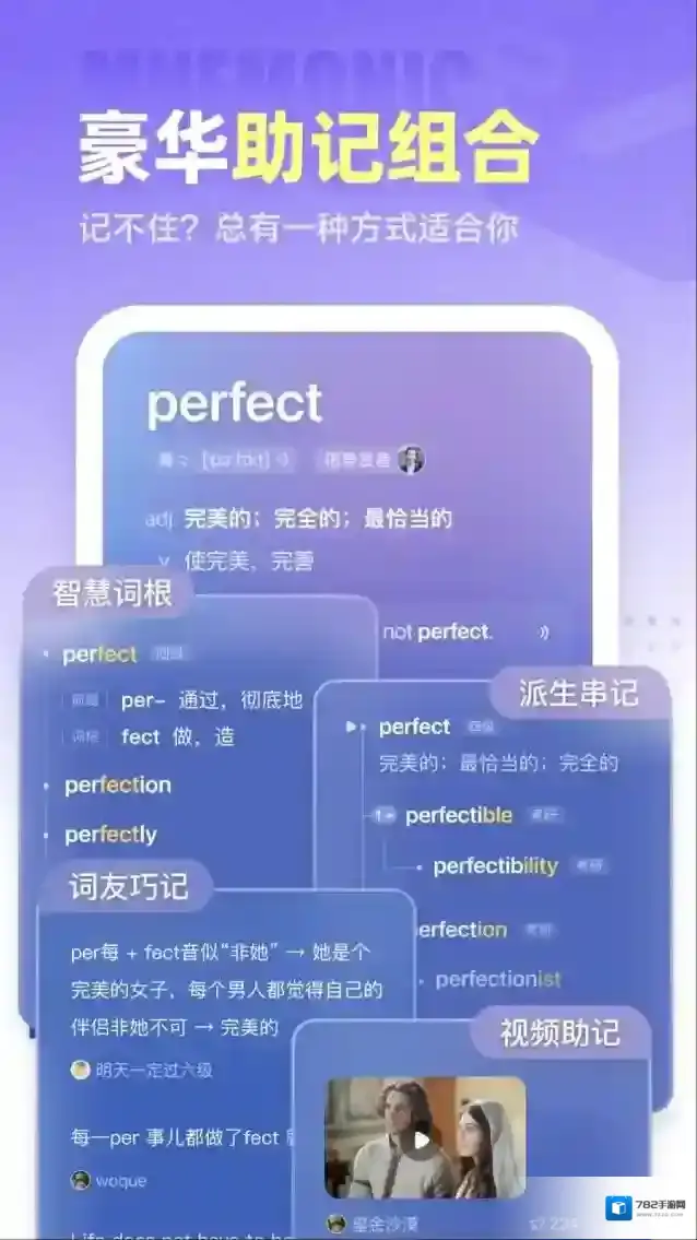 基于超级记忆原理,为单词提供正统、巧记、搞笑、笔记四种记忆模式,强大您的单词记忆网络!