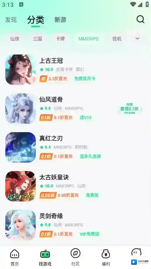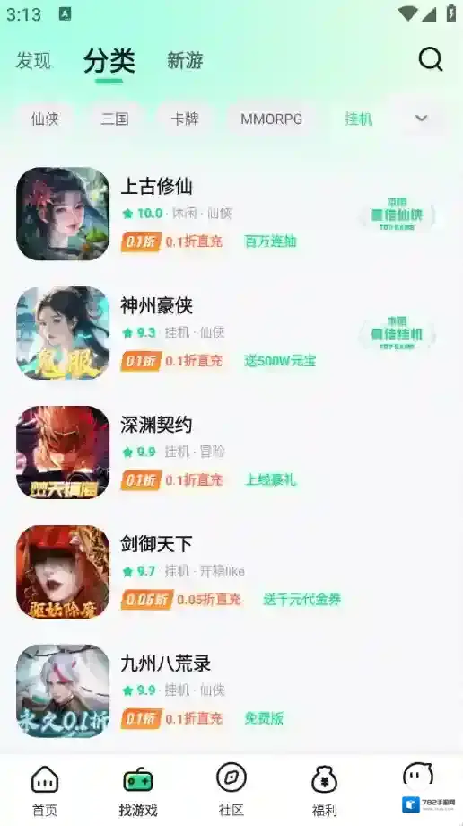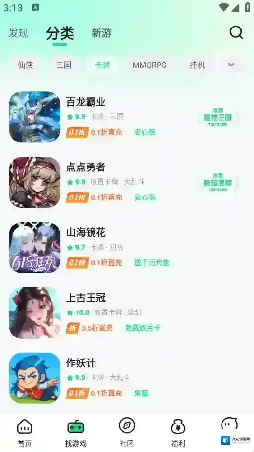 3、“找游戏”页面将游戏进行了详细的归类,包含了三国、传奇以及卡牌等类型。