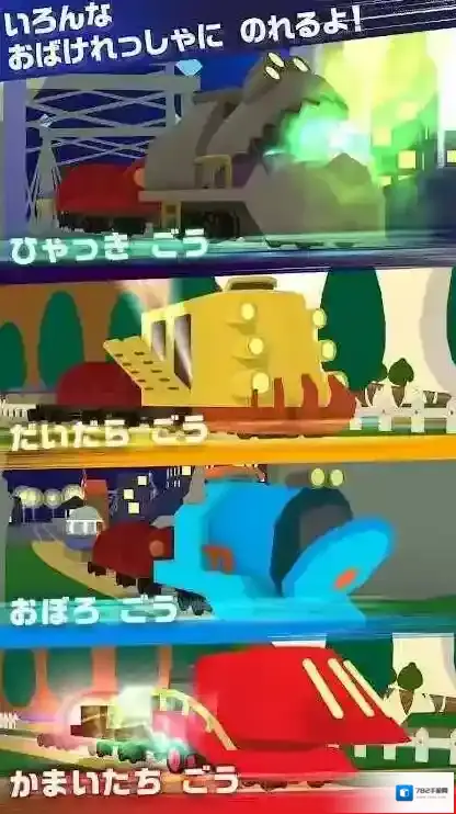 2、在火车选择界面,根据箭头指向,选择下方的蓝色火车(おぼろ-こう(胧号)),进入相关游戏环节。