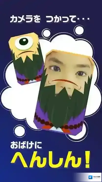 1、在拍照界面,按照“カメラを-つかって(使用相机)”的提示,使用相机拍摄面部,生成带有达摩形象的效果,然后点击箭头指向位置继续。
