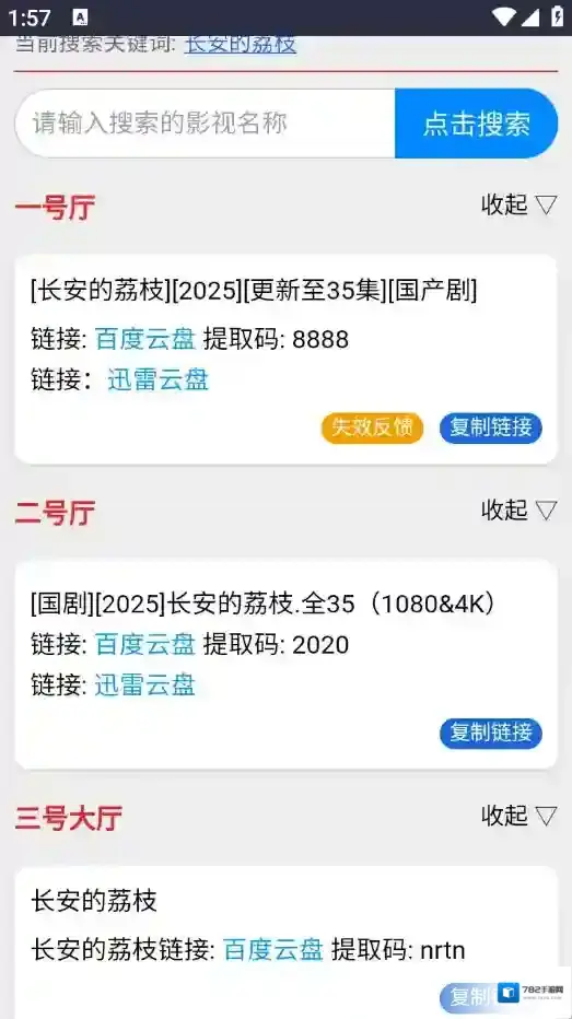 3、用户直接在网站上搜索关键词,即可快速显示各个网盘的影视资源下载链接和提取码,操作方便快捷。</p