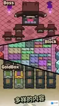 1、进入关卡场景,面对Boss与小怪,先观察Block区域的彩色砖块布局,操控角色,打破砖块推进路线,同时留意“GoldBox”位置,用资源强化战力,挑战Boss。