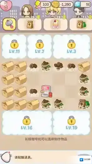 2、点击咖啡机可以获得各种物品,两个相同的物品可以合成更高的等级。