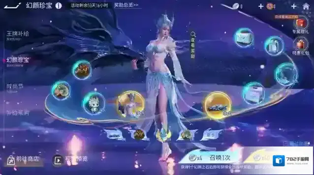 『清龙照影』蓝金渐变的龙角与熠熠生辉的金鳞,是神女最好的象征!纱布层叠,宝石闪烁,是遗世而独立的风姿!幻颜珍宝活动规则:幻颜之石说明[1] 消耗道具外观币可参与活动,在幻颜之石获取区域进行抽奖,每次抽奖都有可能获得幻颜之石。[2] 幻颜之石为特殊道具,获得后会立即自动使用:进入圆环区并随机获得圆环区的任意一个奖励。圆环区说明[1] 每获得一个幻颜之石可参与一次圆环区的抽奖。[2] 每次在圆环区抽奖时必得圆环区上的奖励之一。圆环区的奖励不会重复获得。其他说明[1] 活动开启期间,可在特惠礼包界面购买专属优惠礼包。[2] 当获得清龙照影时装后,可在活动界面领取专属赠礼:清龙之影发型、清龙之影时装和清龙照影专属称号。