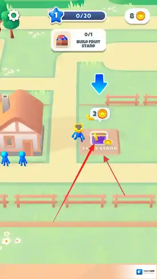 1、“建造设施”,消耗金币,点击建造水果摊、剑士营地等建筑,拓展小镇功能。