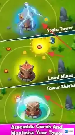 3、“组合卡牌”,装配特斯拉塔、地雷等卡牌,策略搭配,最大化塔楼防御效果。