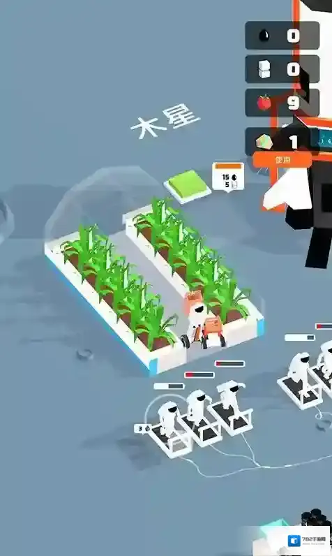 2、在“科技实验室”消耗资源研发太空种植技术,建造“植物培育舱”种植蔬菜,通过浇水、光照调节提升作物产量,满足基地生存需求。