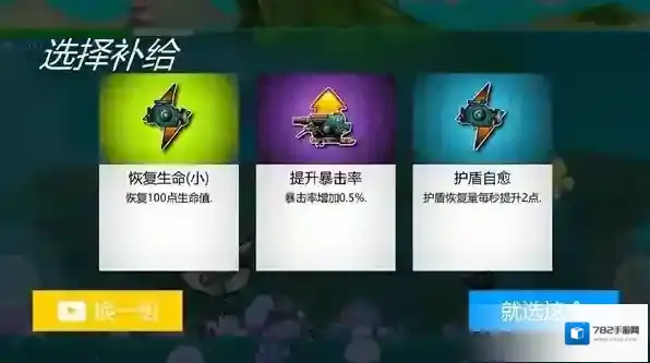 3、当出现“选择补给”界面时,根据当前潜水艇护盾状态,选择合适的补给选项,如“护盾自愈”等,点击“就选这个”确认选择,增强潜水艇续航能力,继续游戏。