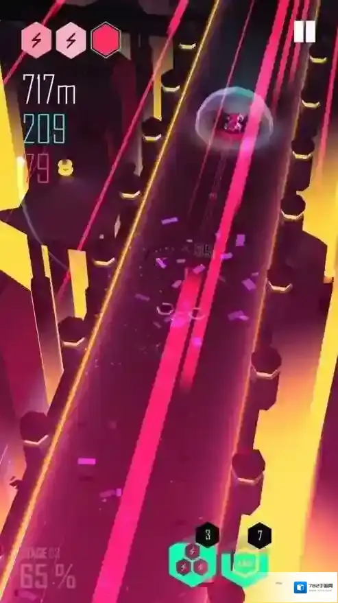 2、视觉特效盛宴:发光盒子碰撞方块时触发粒子爆炸效果,赛道场景随音乐风格切换霓虹、极光等主题,带来强烈视觉冲击。