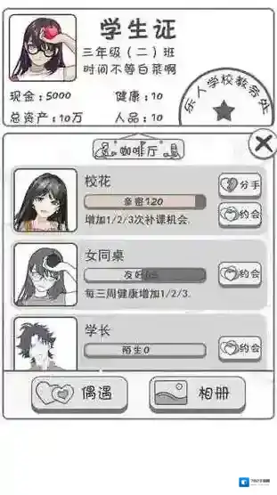 4、丰富的随机事件系统,每个选择都会影响后续发展,从考试作弊到同学求助,各种校园常见情境都会带来不同后果。