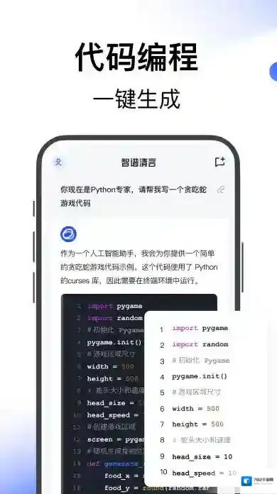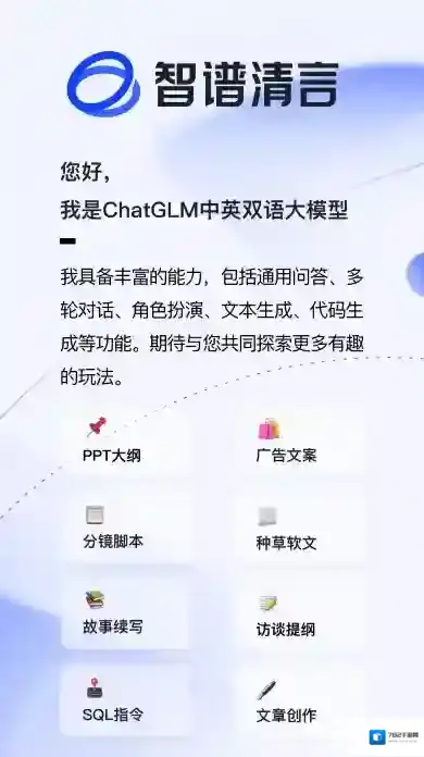 智谱清言是一个能帮你进行语音对话智能生成话语的软件,基于中英双语大模型chatglm开发,帮你“聪明一点”,每天少工作一小时。具备当前很多的丰富能力。