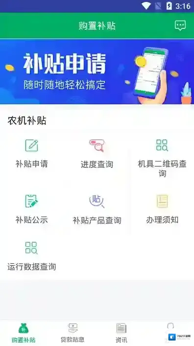 进入软件首页,在购置补贴页面中我们可以看到有补贴申请、进度查询、机具二维码查询、补贴产品查询等等;