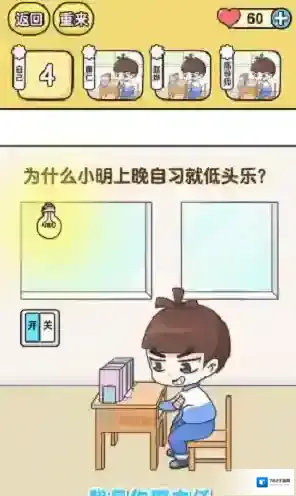 2、观察到小明举着手说忘带作业时,点击红框圈住的手开始检查,界面上方显示有60次提示机会,可在卡关时使用。