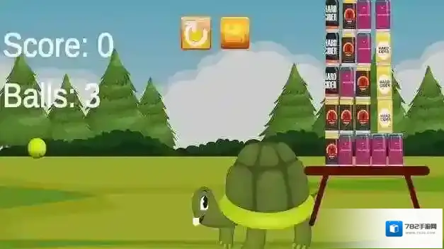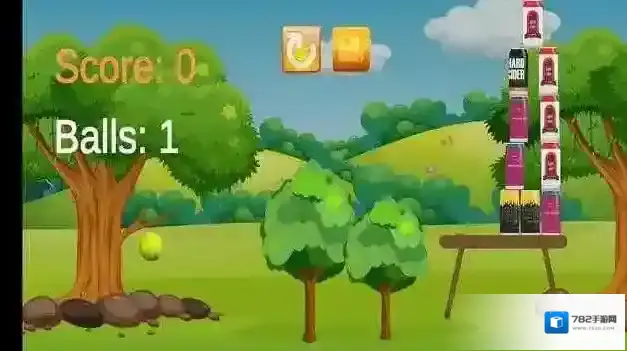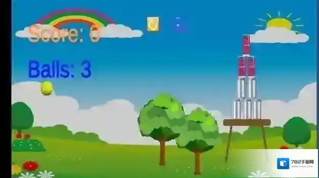 2、按手指滑动提示操控网球,瞄准易拉罐堆击打,利用3个初始球,打破易拉罐获分数。