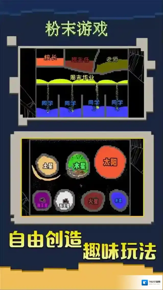 1、自由创造模式,无限制使用所有粉末进行实验,观察不同组合效果,适合实现天马行空的创意,如制作彩虹瀑布或发光森林。