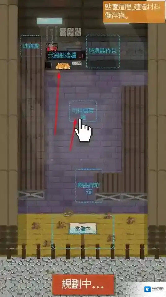 1、“建造工坊”,在工坊区域建造材料储存箱、武器锻造炉等建筑,规划生产布局。