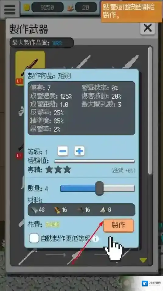 2、“锻造武器”,进入制作界面,消耗材料(金属、木材),锻造武器(短剑),提升品质。
