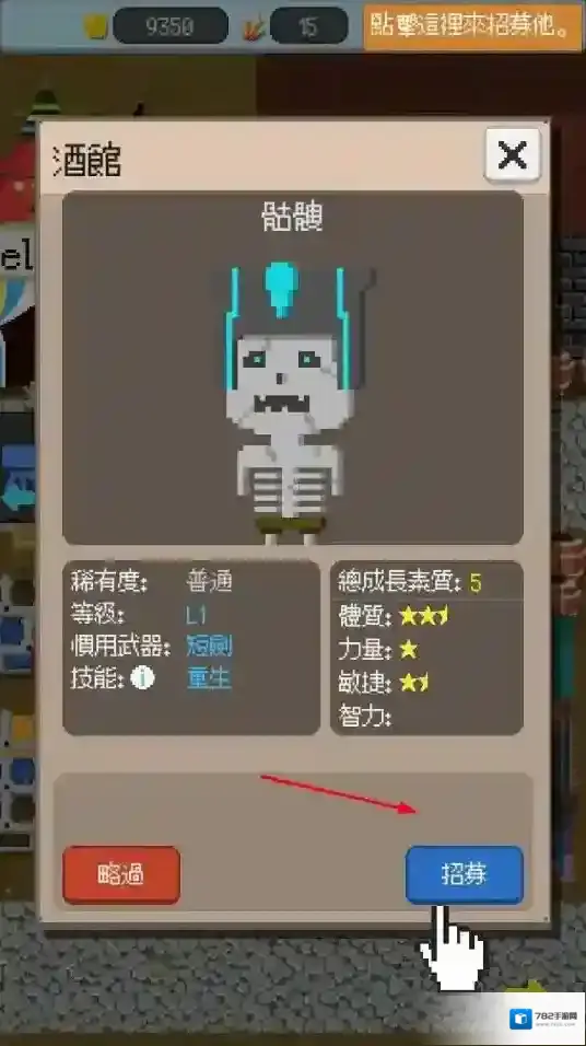 3、“招募英雄”,前往酒馆,查看角色(骷髅)属性、技能,消耗资源招募,组建战斗队伍。